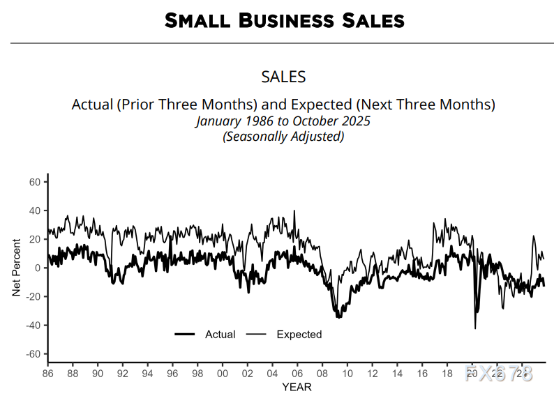 经季节性调整后,60%的企业主受供应链中断影响(较9月降4个百分点),其中39%为轻微影响,39%未受影响,13%的企业主报告过去三个月名义销售额增长(较9月降6个百分点)。