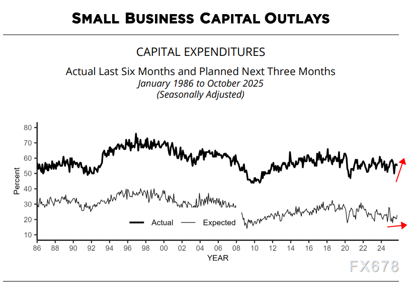 55%的企业主报告过去六个月有资本支出(较9月降1个百分点),主要用于新设备、车辆及设施改善。