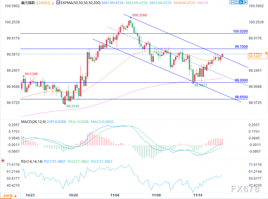 目前美元指数交投于99.55附近,处于11月初以来形成的下降通道边缘附近。美元指数面临99.70附近的阻力位,支撑位则在99.00和98.65附近。相对强弱指数(RSI)徘徊在57附近,表明在从超卖区间短暂反弹后,市场呈现中性动能。