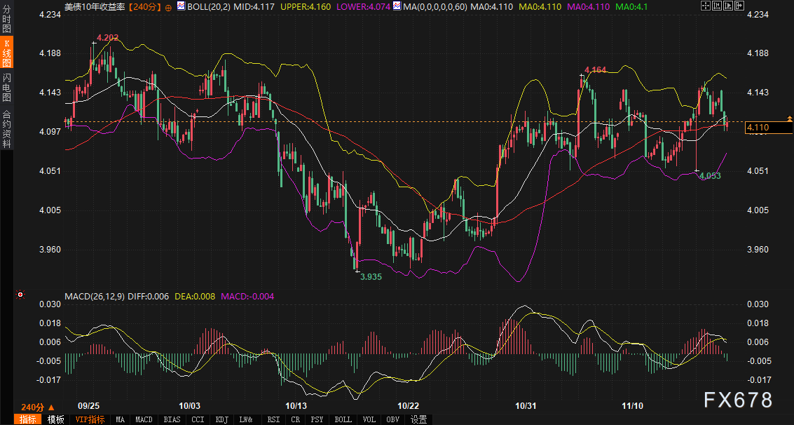 10年期美债收益率240分钟周期运行于下降通道中。最新报价4.110%已跌破布林带中轨4.117%,并逼近下轨4.074%。MACD指标DIFF(0.006)与DEA(0.008)虽仍黏合,但绿柱放大,显示空头动能积聚。