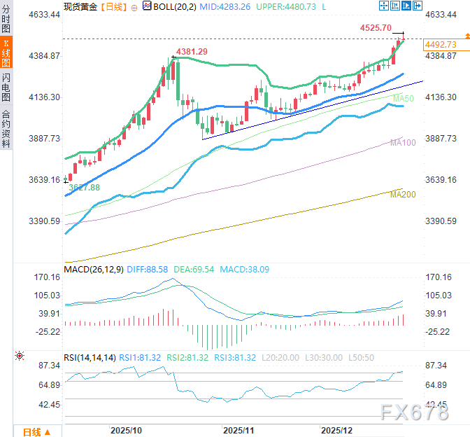 汇通财经APP讯——周三(12月24日)亚欧时段,现货黄金从每盎司4525.70美元的历史高点回落,因圣诞假期前夕,部分交易者获利了结。此外,美国乐观的国内生产总值(GDP)数据也可能对金价构成压力。